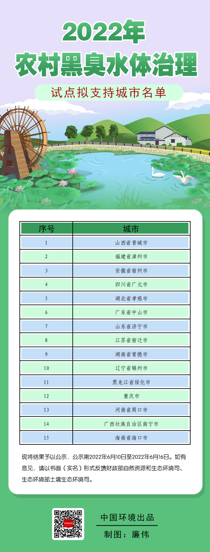 根據競爭性評審結果,財政部、生態環境部擬將15個城市確定為2022年支持的農村黑臭水體治理試點城市,2022年6月10日至2022年6月16日為公示期。期間如有意見,請以書面(實名)形式反饋財政部自然資源和生態環境司、生態環境部土壤生態環境司。