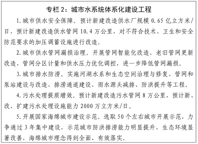 2.加強城市供水安全保障。推進全流程供水設施升級改造。加快對水廠、管網(wǎng)和加壓調(diào)蓄設施的更新改造,保障用戶龍頭水水質安全。有條件的地區(qū)要設置水量、水質、水壓等指標在線監(jiān)測,加強供水安全風險管理。強化城市節(jié)水工作。實施國家節(jié)水行動,推進節(jié)水型城市建設。實施供水管網(wǎng)漏損治理工程,推進老舊管網(wǎng)改造,開展供水管網(wǎng)分區(qū)計量管理,控制管網(wǎng)漏損。推進節(jié)水型單位、企業(yè)和小區(qū)建設,推動建筑節(jié)水,推廣普及節(jié)水器具。加快推動城市生活污水資源化利用,鼓勵將再生水優(yōu)先用于生態(tài)補水、工業(yè)生產(chǎn)、市政雜用等方面,強化再生水的多元利用、梯級利用和安全利用,促進再生水成為缺水城市的“第二水源”。