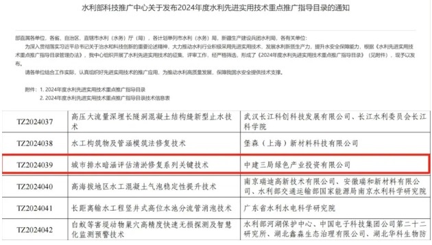 近日,中建三局綠投公司科研成果“城市主干排水暗涵評估清淤修復關鍵技術研究應用”成功入選《2024年水利部先進技術重點推廣指導目錄》。該目錄旨在圍繞國家重大戰(zhàn)略實施,和水利高質(zhì)量發(fā)展需求,遴選先進、成熟、實用的技術,面向社會公布,推動行業(yè)技術水平升級提高。